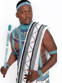 A waistcoat, long necklaces, throat bands, armbands, leggings and belts are part of his regalia. The dominant colours in the beadwork are white and navy blue, with some yellow and green beads symbolising fertility and a new life, respectively. Xhosa people regard white as the colour of purity and mediation; white beads are still used as offerings to spirits or to the creator. Amagqirha/diviners use white beads when communicating with the ancestors . These diviners also carry with them beaded spears, which are associated with the ancestors that inspire the diviner; beaded horns; and calabashes, to hold medicinal products or snuff. "Amageza", a veil made of beads, is also part of their regalia, they use these beads by swaying them in someone's eyes so as to induce a trance-like state.